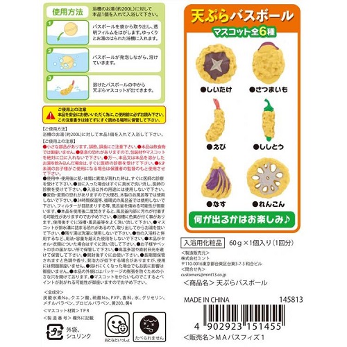 When placed in hot water, it fizzes like oil for frying tempura, and a tempura mascot comes out from inside. There are 6 kinds of mascots (shrimp, shiitake mushroom, sweet potato, eggplant, lotus root, and Shishito). The bath bombs are lemon-scented.