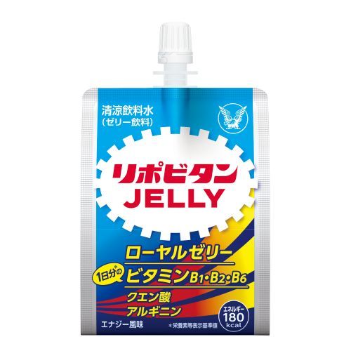 リポビタンゼリーの特長:1袋180kcal(約おにぎり1個分)。三大栄養素(糖質・脂質・タンパク質)をエネルギーに変換するのをサポートする『ビタミンB群(B1・B2・B6)』を配合。 『ローヤルゼリー・クエン酸・アルギニン』など嬉しい成分も配合。
