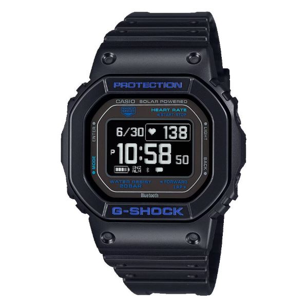 The design is sporty, featuring a popular black color with blue accent highlights. It also includes a high-visibility, high-resolution MIP LCD. The watch supports both USB charging and solar charging, enhancing its practicality. The G-SQUAD DW-H5600 series is perfect for both sports and daily use.