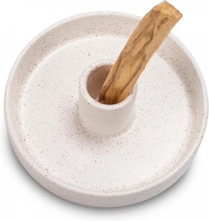 Palo Santo Stick Holder. The cylinder of this palo santo holder has a diameter of 2.5 cm and holds most standard size palo santo sticks of 10~15 cm. If the palo santo stick does not fit perfectly in the hole, try shaping the end of the incense stick with a knife. Shape: Circular Material: Ceramic Brand: PINCASOL Color: White Product Dimensions: L10.8 x W10.8 x H4 cm